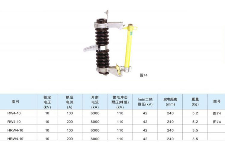 RW4-10型跌落式熔断器,适用于6~10千伏交流50赫兹的配电线路和电力变压器,作短路保护。